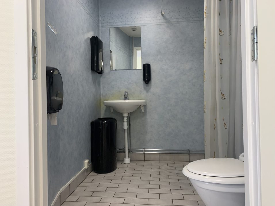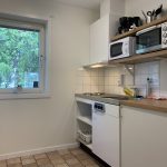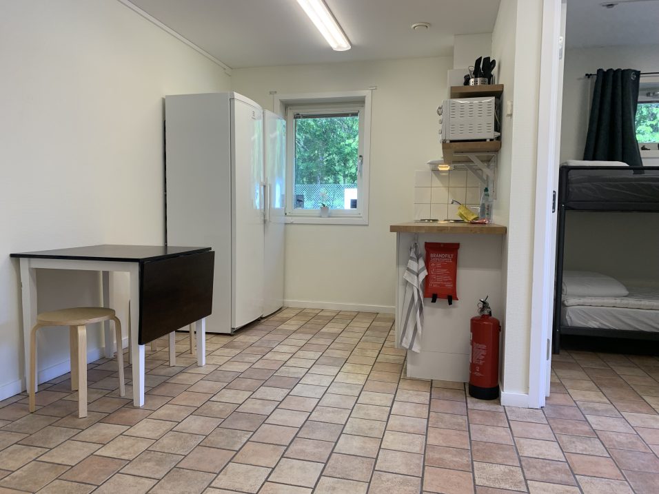 I allrum och kök finns sittplatser och bord. Stugan har ett eget badrum med wc och dusch. Det finns också en liten uteplats mot parkeringen.